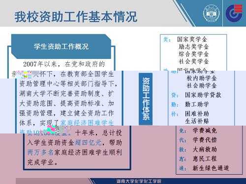 會議伊始,化工院資助助管王一鳴給“愛心使者”們介紹了黨的十九大以來更健全的學生資助制度,其中包括資助投入大幅增加、資助政策體系在不斷完善、資助管理政策在不斷優化。而相應的政策實施在湖大學子身上就是“獎、助、貸、勤、補、免、代、救、惠、通”十餘個方面。