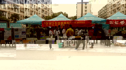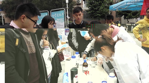 此次開幕式中的現場實驗演示引來了路人們的充分關注。“藍瓶子”實驗可以将燒杯裡的液體在藍色和無色之間任意轉換,“大象牙膏”實驗是通過加入洗衣液形成巨大的“牙膏”,“可燃冰”實驗能夠讓人看見“冰塊”着火這一神奇的實驗現象,而“雪花飄飄”則是天氣瓶的制作,瓶中絢麗的雪花晶瑩如玉。圍觀實驗的同學們紛紛驚歎于化學的神奇之處,感受到了化學在生活中的樂趣。有的同學看完實驗之後躍躍欲試,并在志願者的指導下完成了一些簡單的實驗,他們動手實踐之後更加切身體會到了化學實驗的獨特魅力。精彩絕倫的實驗讓同學們對天氣瓶的制作和課桌文化大掃除活動産生了濃厚的興趣,因而活動現場的招募也得到了同學們的積極響應和大力支持。