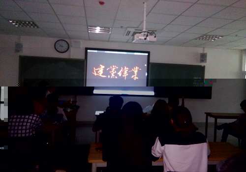 晚18:50,在團支書吳凡同學的組織下,全班同學準時到達了教室。首先進行了此次活動的第一項——觀賞電影《建黨偉業》。随着音響中帶着年代感的聲音響起,影片裡每一幀畫面在同學們眼前不停轉換,故事拉開了帷幕。同學們逐漸陷入到這激情熱血又充滿曆史感的劇情當中。