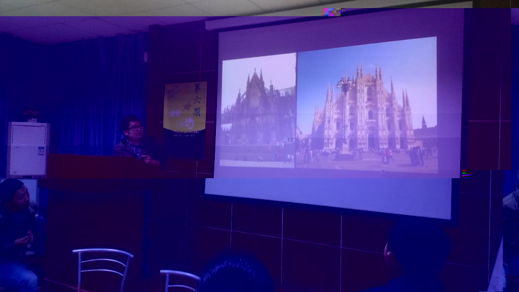 首先,兩位老師以他們的切身經曆,從出國前的準備、怎樣過語言關、如何渡過留學生活等方面給同學們提出一些建議。許峰老師告訴大家,留學也許在最開始時會很痛苦,但這是一個心靈成長蛻變的過程,最終會把一個人變得自信和獨立。唐昊老師在講解出國申請時告誡大家,在材料上填寫成績時要真實。而最精彩的,便是許峰老師講述他窮遊歐洲各國的部分。他為同學們展示了他在各個國家拍攝的照片,并用輕松幽默的語言講述他的旅途故事和異國文化。這些照片拍攝自意大利、德國、瑞典、芬蘭等許多國家,其中有比薩斜塔、巴黎聖母院、埃菲爾鐵塔、水城威尼斯,甚至北極圈漫天的冰雪。這些照片帶同學們領略了異國風情,引得大家連連贊歎。