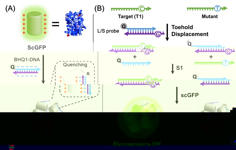 發展新型分子工具對于生命分析化學具有重要意義。超電荷熒光蛋白是經過蛋白質工程表面重組得到的一種新型熒光蛋白,其具有高穩定性、極佳的細胞穿透性以及優良的生物大分子載體性質。聶舟教授課題組首次利用這種新型蛋白分子工具構建通用化核酸傳感信号單元,結合Toehold核酸探針和單鍊核酸酶特異性識别,發展了一種具有高特異性的DNA點突變檢測方法,該方法具有極低的熒光背景,檢測簡單快速,能夠高特異性的區分單堿基突變等優點。并進一步将該方法與亞硫酸氫鹽處理和核酸級聯擴增相結合,發展了一種特定基因位點甲基化程度的高靈敏熒光分析方法,并用于結腸癌病人的實際癌症組織樣本分析,實現了結腸組織樣品p16基因位點甲基化程度的定量檢測,所得結果與甲基化測序結果一緻,證明了該方法具有用于DNA甲基化臨床診斷的可能性。該論文被Angew. Chem. Int. Ed.雜志甄選為熱點文章(hot paper)。