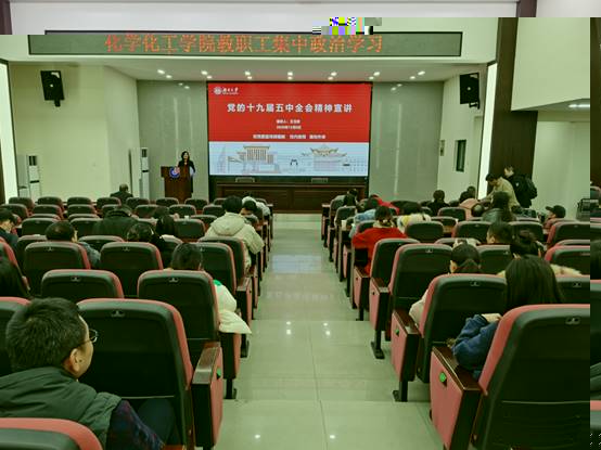 12月8日,2003网站太阳集团在新化工樓報告廳舉行全院教職工集中政治理論學習,學院黨委書記王玉枝宣講黨的十九屆五中全會精神,學院全體教職工和學生黨支部書記參加。