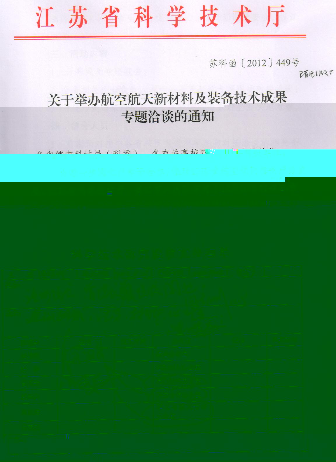 江蘇省科學技術廳 蘇科函〔2012〕449号 關于舉辦航空航天新材料及裝備技術成果 專題洽談的通知 各省轄市科技局(科委),各有關高校院所,各有關單位: 為進一步深化産學研合作,推動江蘇省航空航天相關産業發展,江蘇省科學技術廳、鎮江市人民政府定于12月20日在鎮江市聯合舉辦“2012年江蘇省産學研專場對接洽談會——航空航天新材料及裝備技術成果專題洽談”活動。有關事項通知如下: 一、時間地點 時間:2012年12月20日(上午9:00開始),19日全天報到。 地點:鎮江明都大飯店(鎮江新區丁卯智慧大道470号,總機電話0511—88778888)。 二、辦會單位 主辦單位:江蘇省科學技術廳,鎮江市人民政府 支持單位:中國商飛公司設計院,中國航天科工集團三、四、六院,中國航天科技集團一院,西北工業大學,北京航空航天大學,南京航空航天大學 承辦單位:江蘇省生産力促進中心,鎮江新區管委會,鎮江市科技局 三、活動内容 1、開幕式及專題報告; 2、全省相關企業負責人與參會高校院所專家現場對接洽談; 3、對接洽談結束後組織部分高校院所專家赴企業實地考察。 四、參會人員 1、前期預對接中各省轄市報送的有意向對接洽談的相關企業負責人或技術副總; 2、邀請參會的高校院所專家; 3、各省轄市科技局分管局長、相關處室負責人,有關縣(市、區)科技局分管局長、相關科室負責人; 4、主辦單位和支持單位相關領導。 五、有關要求 1、請各省轄市科技局将本轄區參會人員名單,請各有關高校院所科技處将本單位參會人員名單,于12月12日下班前同時報送鎮江市科技局科技合作處(郵箱:此郵件地址受spam bots保護,需要使用 Javascript 功能來查閱。)和江蘇省生産力中心産學研部(郵箱:此郵件地址受spam bots保護,需要使用 Javascript 功能來查閱。)。 2、請各省轄市科技局、各有關高校院所科技處明确1名聯絡員于12月19日19:30到鎮江明都大飯店參加預備會。請所有參會人員于12月20日08:45前進入開幕式會場。 3、本次會議統一安排食宿,除辦會單位代表外,其他參會人員住宿費用自理。 聯系人: 鎮江市科技局科技合作處 徐光陸 電話:0511—80822818,13776474778 江蘇省生産力促進中心産學研部 李岱 電話:025—85485968,18751848744 江蘇省科技廳産學研合作處 鄭東明 電話:025—83363139 附件:參會人員名單回執表 江蘇省科學技術廳 2012年12月4日 附件: 參會人員名單回執表 報送單位:————,聯絡員姓名:————,職務:————,手機号碼:————